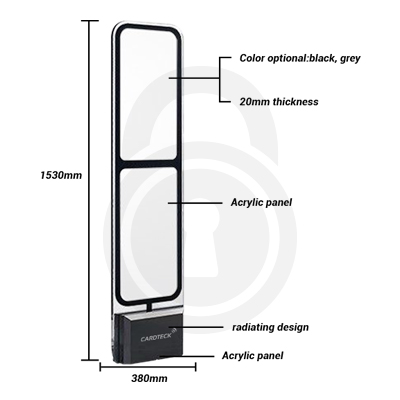 The detectors for such tags emit periodic tonal bursts at about 58 kHz, the same as the resonance frequency of the amorphous strips.[3] This causes the strip to vibrate longitudinally by magnetostriction, and it continues to oscillate after the burst is over. The vibration causes a change in magnetization in the amorphous strip, which induces an AC voltage in the receiver antenna. If this signal meets the required parameters (correct frequency, repetition, etc.), the alarm is activated.